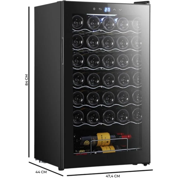 Mit einem großzügigen Fassungsvermögen von 80 Litern bietet der Cecotec Bolero GrandSommelier 34030 Platz für bis zu 34 Flaschen und schafft optimale Bedingungen für die langfristige Lagerung oder den sofortigen Genuss hochwertiger Weine. Das moderne Kompressorsystem sorgt für eine zuverlässige Kühlung und hält die eingestellte Temperatur konstant – zwischen 5 und 18 ºC, je nach Weinart und Lagerungswunsch. Trotz seiner Leistung arbeitet das Gerät besonders leise mit nur 41 dB und völlig vibrationsfrei – ideal für eine ruhige und entspannte Atmosphäre. Über das integrierte Touch-Bedienfeld mit digitalem Display lassen sich alle Funktionen intuitiv steuern: Temperaturregelung, Umschalten zwischen Celsius und Fahrenheit sowie das Ein- und Ausschalten der LED-Innenbeleuchtung. Die stilvolle LED-Beleuchtung im Innenraum sorgt für Übersichtlichkeit und setzt die gelagerten Flaschen gekonnt in Szene.Art.-Nr.: 100157138