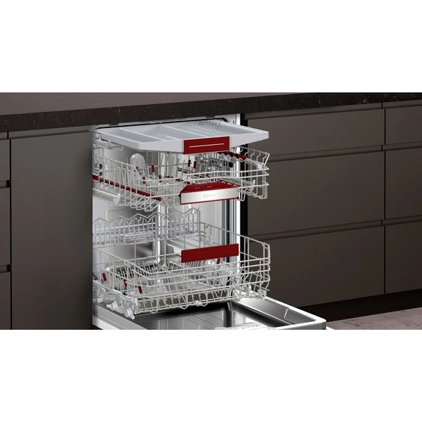 Der integrierbare Geschirrspüler Neff S145ECS00E bis zu 14 Maßgedecke auf. Zur Verfügung stehen sechs verschiedene Spülprogramme sowie vier Zusatzfunktionen. Das Chef 70°-Profi-Programm entfernt auch hartnäckigen Schmutz an Töpfen und Auflaufformen dank angehobener Temperaturen und einem erhöhten Wasserdruck beim Spülstrahl. Die Flex 2-Körbe und die Besteckschublade lassen sich flexibel beladen. Open Dry sorgt für ein automatisches Öffnen der Türe während der Trockenphase für noch trockeneres Geschirr. Für optimale Sicherheit sorgt beim S145ECS00E das AquaStop-Wasserschutzsystem. Mit einer Lautstärke von 42 Dezibel ist der S145ECS00E zudem angenehm leise. Dank der Home Connect-App ist der Geschirrspüler S145ECS00E über Handy oder Tablet steuerbar.Art.-Nr.: 100039521